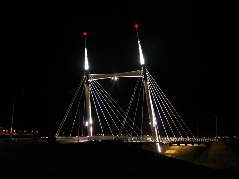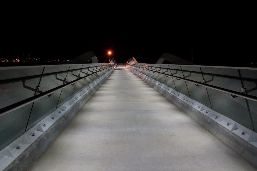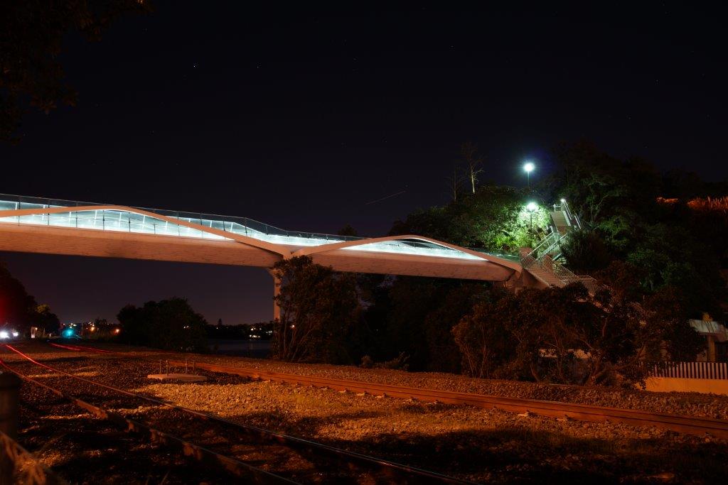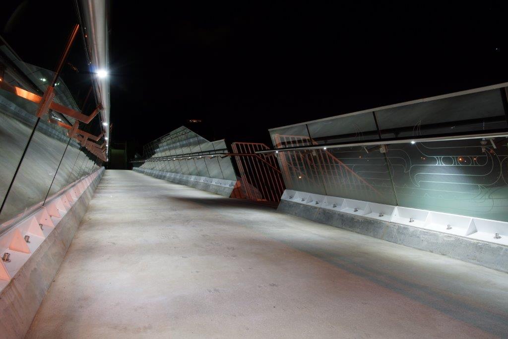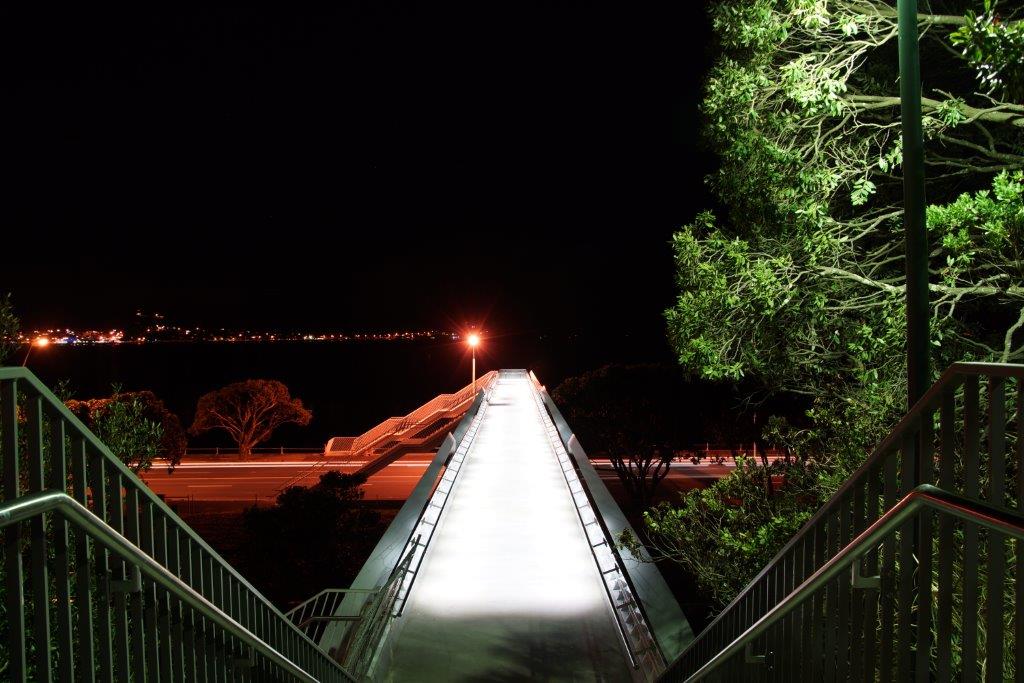 Point Resolution Footbridge runs between the Parnell baths and Tamaki Drive. Just tricky from a logistics point of view, tricky to install the LED lights and hide the wiring into a skinny handrail above a working Railway Track. It looks great.